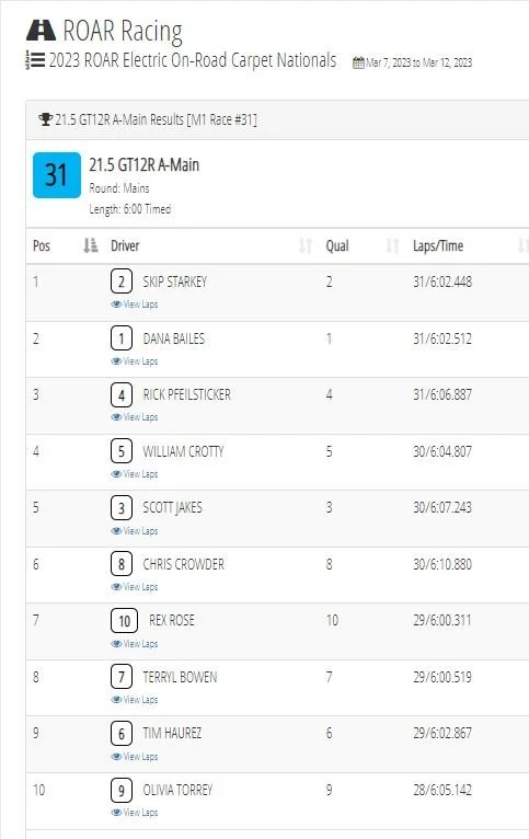 stephen radecky 5/2/25 stephen radecky 5/2/25 SuperRad wins Euros! Read More stephen radecky 10/15/24 stephen radecky 10/15/24 Another win for SuperZGT! Read More stephen radecky 3/26/24 stephen radecky 3/26/24 SuperZGT dominates ROAR Nats! Read More stephen radecky 3/26/24 stephen radecky 3/26/24 SR-06 wins BRCA Nationals! Read More stephen radecky 12/25/23 stephen radecky 12/25/23 Podium finish for SR-06 at IFMAR 1/12 Worlds! Read More stephen radecky 10/31/23 stephen radecky 10/31/23 SuperKura wins Halloween Classic! Read More stephen radecky 3/14/23 stephen radecky 3/14/23 SuperKura US National Champ! Read More stephen radecky 1/10/23 stephen radecky 1/10/23 SuperKura wins Hudy Indoor Champs! Read More stephen radecky 11/1/22 stephen radecky 11/1/22 SuperRad wins Halloween Classic! Read More stephen radecky 10/9/22 stephen radecky 10/9/22 SuperRad wins NYGP! Read More